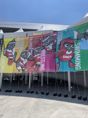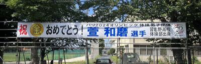 本校の卒業生である萱和磨(かや かずま)選手が、オリンピック 体操競技 男子団体総合の決勝戦で、金メダルを獲得されたことに対し、学校の祝意を込めて、横断幕を設置いたしました。