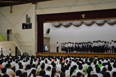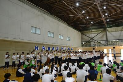 各部活動の代表生徒のスピーチの後、激励の言葉がかけられ、その後は吹奏楽部・バトン部からエールが送られました。