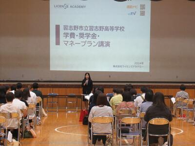 進路アドバイザーの髙野亜希子氏をお招きし、学費・奨学金・マネープランについてご講演いただきました。学校種による学費の違いや、学費以外の学校生活にかかる費用、複雑な奨学金の制度について丁寧に解説していただきました。髙野氏の講演後は、本校進路指導主事の渡邉千知教諭から大学入試と本校生徒の進路動向について説明しました。