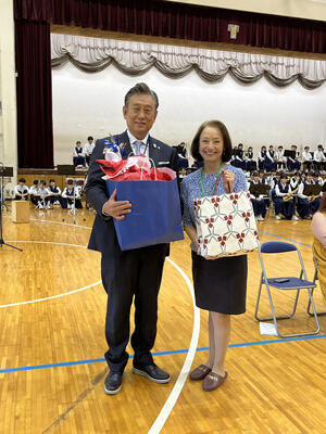 歓迎会では、訪問団の挨拶や本校校長の田口富一と訪問団長リサ・キーズ氏による記念品交換、さらに吹奏楽部による歓迎演奏が行われ、アットホームな雰囲気の中で訪問団を迎えることができました。