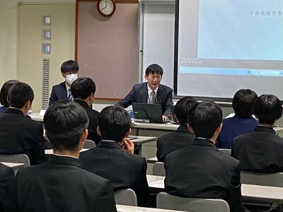 県教育庁教職員課の梅原管理主事と市原市で特別支援学校の教員となった同校卒業生の小倉先生をお招きし、教員の仕事とはどのようなものかを具体的に講義をしていただきました。熱心に耳を傾けていた生徒から質問もあがり、内容の濃い講座となりました。