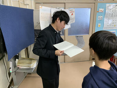 次に、習志野第一中学校 小野 未来先生(吹奏楽部OG)の講義予定でしたが、急遽来校できなかったため、小野先生が作成された資料を活用し、梅原管理主事が代わりに説明を行いました。