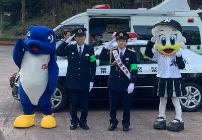 年末年始特別警戒取締り出動式で挨拶をした後、防犯意識の向上と交通事故防止を呼びかけるキャンペーンを行いました。